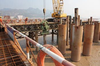 3、 栈桥工程及海上作业平台:主要用于搭建桥梁、码头、港口等等涉水工程前期的一个施工通道或平台,振动锤在此过程中有着不可忽视的作用,用振动锤打桩搭建的栈桥以后拆除也非常便捷,如用其他设备施工完成的栈桥,不利于施工完毕后拆除,造成资源及经济的浪费。