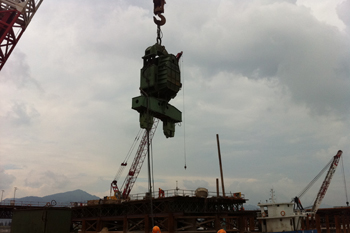 It is efficient to use large electric vibratory hammer to drive casing pile into the sea , environmentally friendly and easy to adjust.